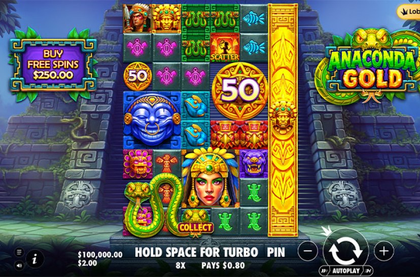 Enter a deadly temple in Anaconda Gold, a tumbling slot that grows from a 6×4 grid up to 6×8. Giant symbols can cover massive areas, crushing those beneath, while wilds spread unpredictably. With expanding reels and escalating wins, this snake-infested adventure delivers intense, high-impact gameplay.