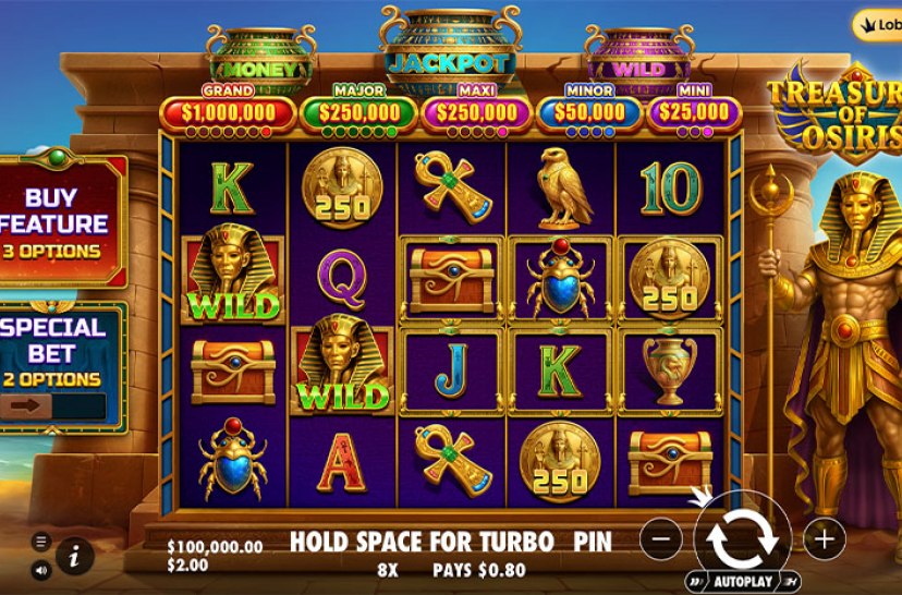 Embark on a divine quest in Treasures of Osiris, set on a 5×4 grid filled with ancient Egyptian symbols. Special Wild, Money, and Jackpot icons can randomly trigger the bonus game, awarding 10 Free Spins and activating up to three powerful modifiers. A myth-rich slot packed with variety and golden win potential.