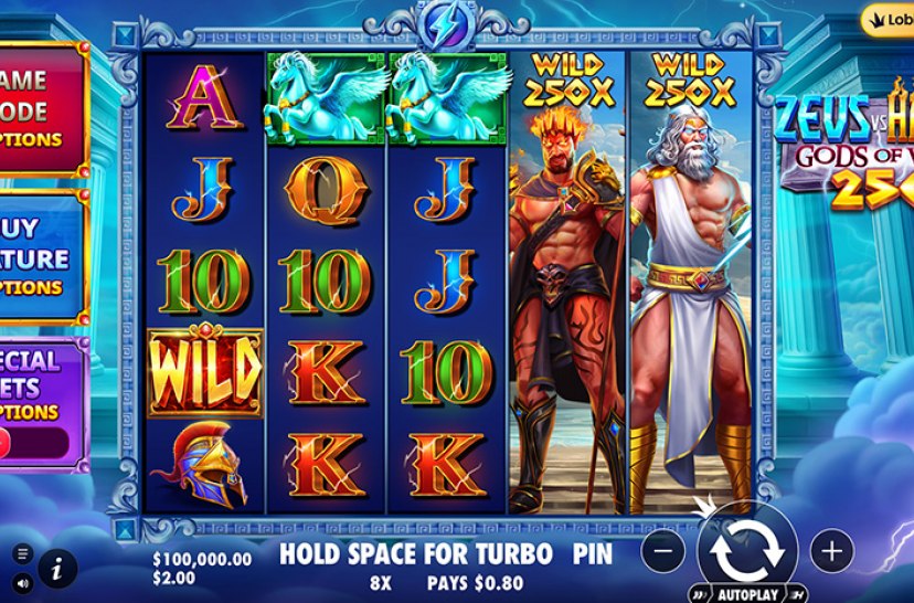 The gods clash once more in Zeus vs Hades – Gods of War 250, an epic slot where players choose between two volatility modes. Fight for Olympus with balanced action or descend into Hades for higher risk and greater rewards. Mythic visuals and powerful features drive intense gameplay in this divine battle of fate.
